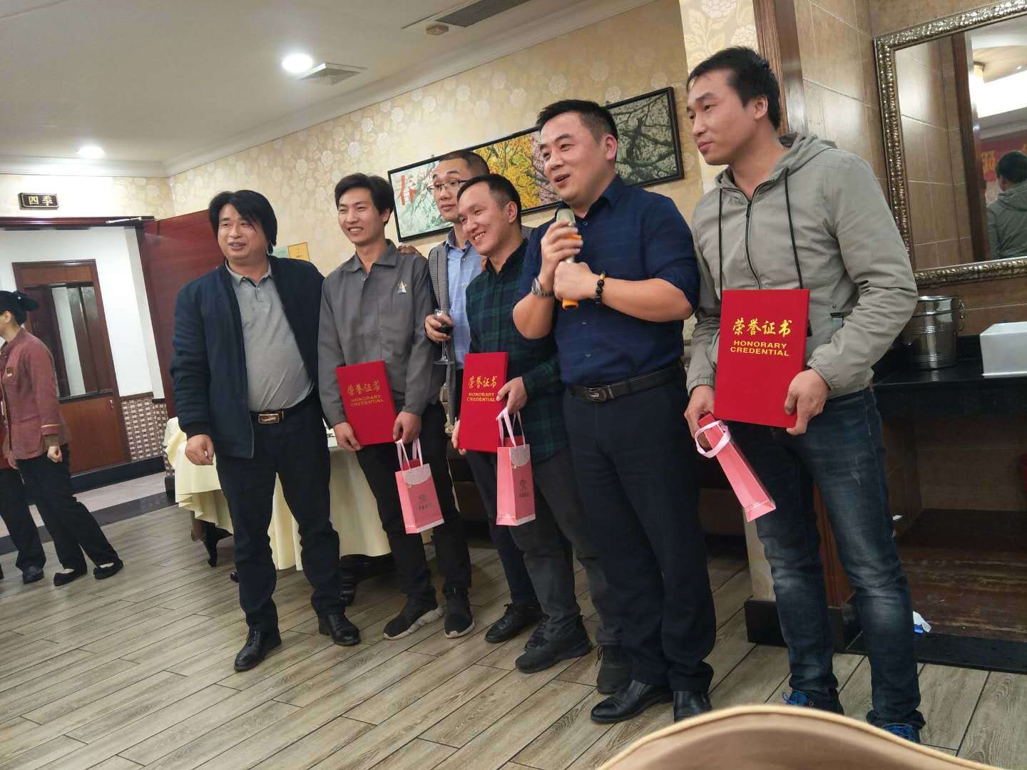 晚宴最后,舒總攜手林總、鄭總一起為研發部和生產部幾名做出了突出貢獻的員工頒發了榮譽證書!