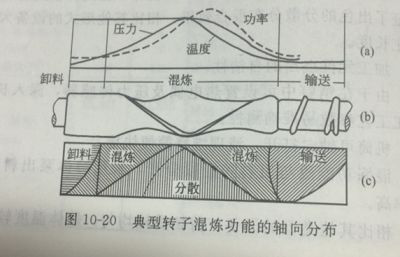 混煉主要起到分布混合的作用;而碾磨主要起到分散混合的作用。圖10-20中的(a)圖表示混煉功率,混煉溫度和混煉壓力沿螺桿軸向的分布情況??梢?,在轉子反向螺紋的交匯點靠近進料口的位置,也就是熔體物料同時發(fā)生熔化、混煉和碾磨的區(qū)域,壓力、溫度和功率均達到最大值。